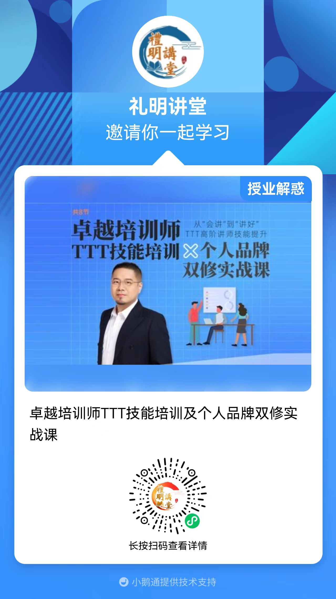 4、可以考取证书:参加礼明讲堂的线上TTT课程学习和线下培训后,提交作品且考试通过,即可颁发证书!