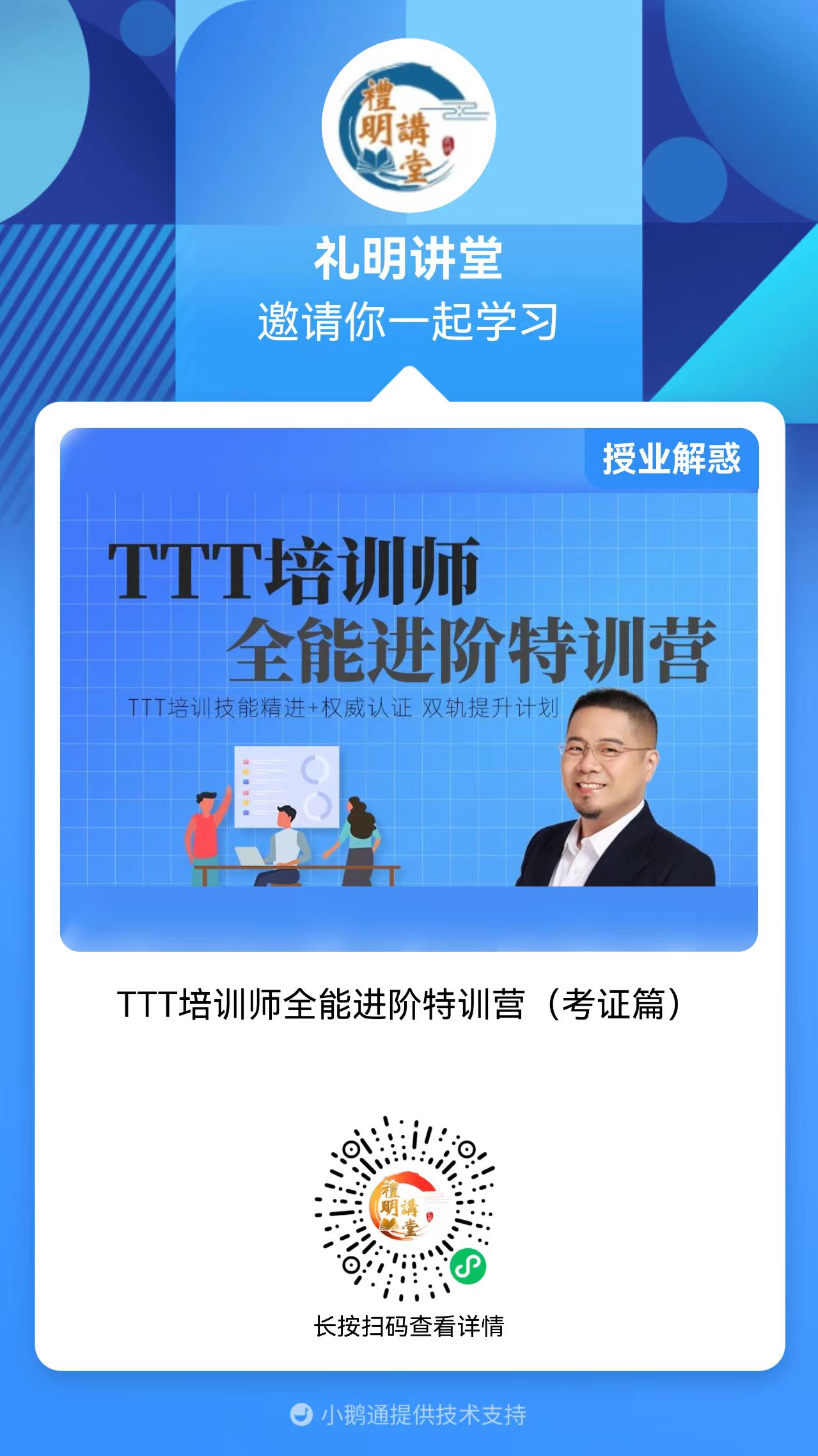 礼明讲堂TTT培训师全能进阶特训营(考证篇)帮助企业培训高质量的培训讲师并建立培训系统,根据企业需求设计培训计划,根据培训课程进行资源配置和组织管理的作用。解决外部培训不能紧贴企业需求的培训不足。通过对企业培训评估程序的建立,也避免了有些企业为了培训而培训的弊病。最终提升培训师的核心能力和技巧。