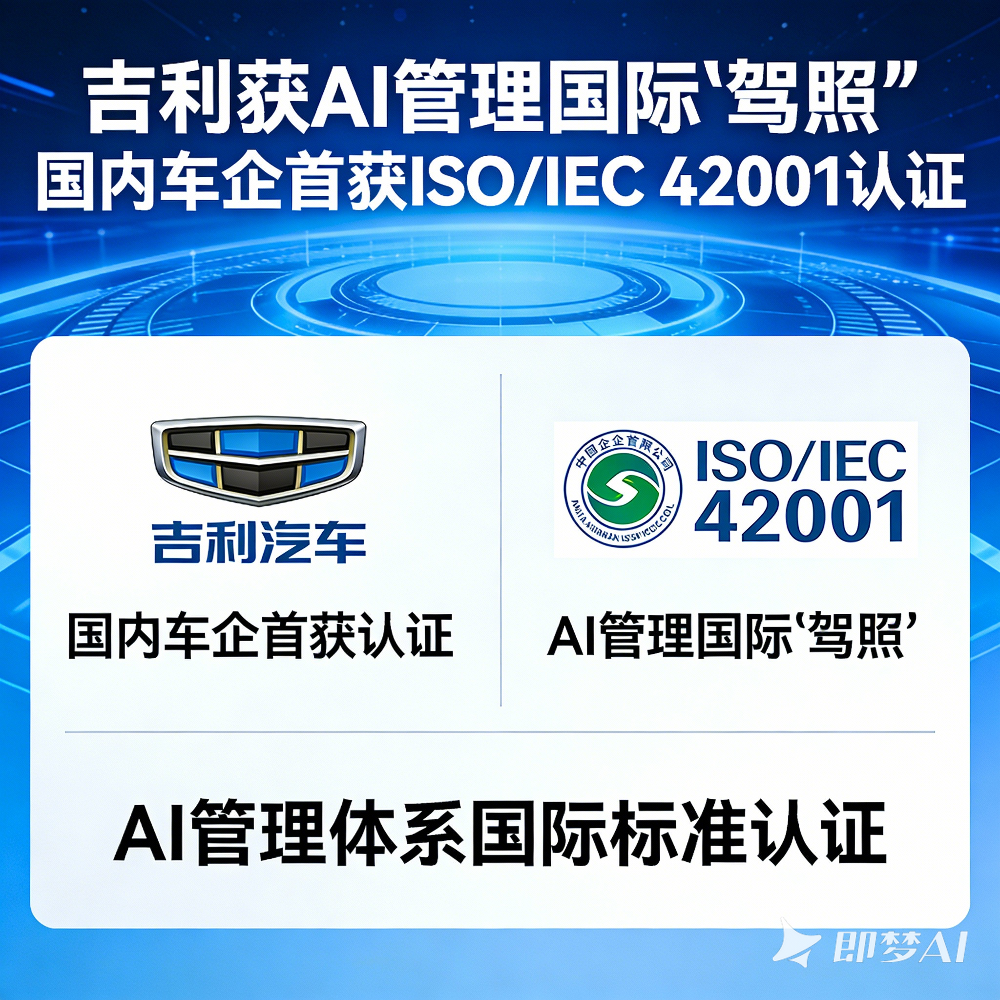 这几天,车圈被一张证书刷屏了:吉利汽车拿到了TÜV南德颁发的ISO/IEC 42001认证,成了国内首家获得该认证的车企。这张证,可不是普通的“合格章”,而是一张AI管理体系的国际“驾照”。