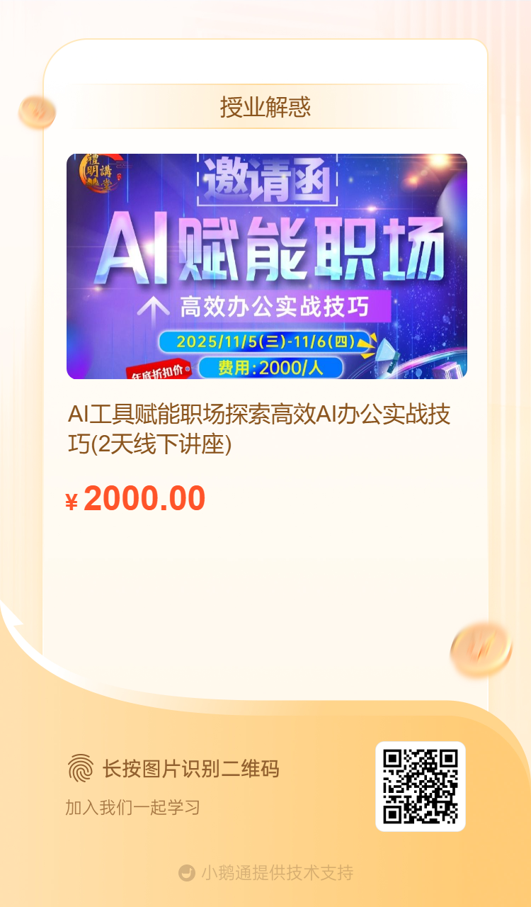 本次讲座将于2025年11月5日(周三)—11月6日(周四)精彩开启,费用2000元/人,三人及以上团购8折起!课程面向企业员工等广大职场人群,无论你是职场小白还是资深人士,都能从中受益。