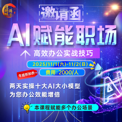 上期礼明讲堂《AI工具赋能职场:高效办公实战技巧》讲座,好多学员没报上喊着加开 —— 这不,AI赋能讲座精品班临时加场来啦!11月5日 - 6日开课,现在只剩2天倒计时,想上车的抓紧!