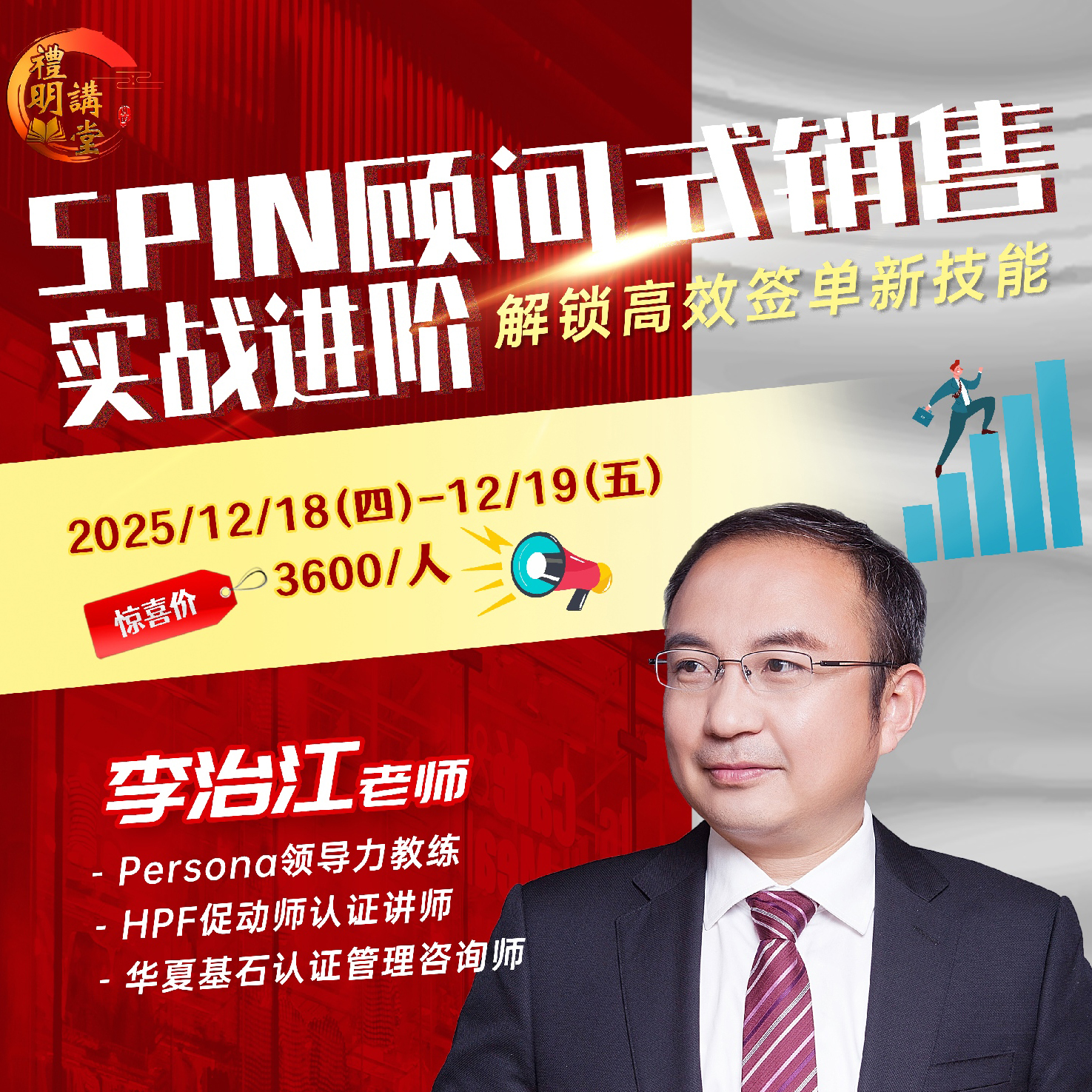 为了帮助大家提升销售能力,实现业绩倍增,礼明讲堂特别推出了“SPIN顾问式销售实战进阶”课程,由资深销售专家李治江老师亲授!